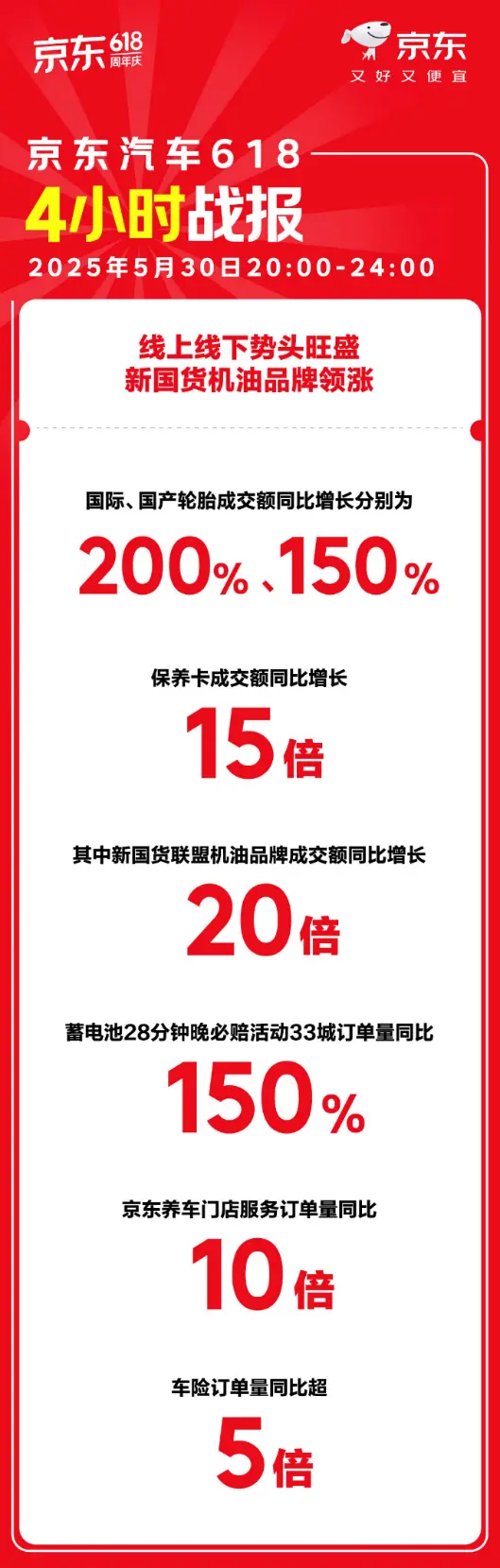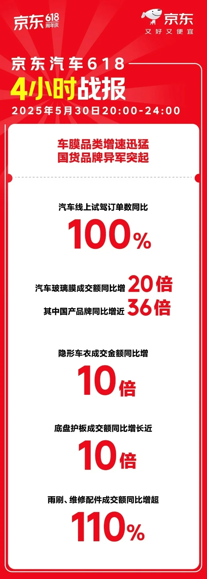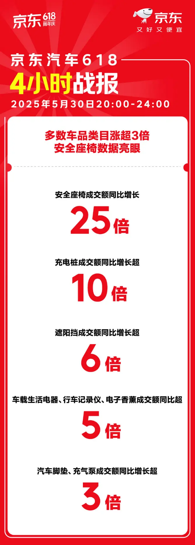 5月30日晚8点,又好又便宜的京东618火热开启。开门红前4小时,京东汽车各业务线全面高速增长,养车新国货强势引领品类增长,汽车用品安全需求与舒适体验消费激增,车辆个性化与保护需求集中释放,服务保障型消费持续扩容,全面展现出汽车消费领域的强劲增长势能。