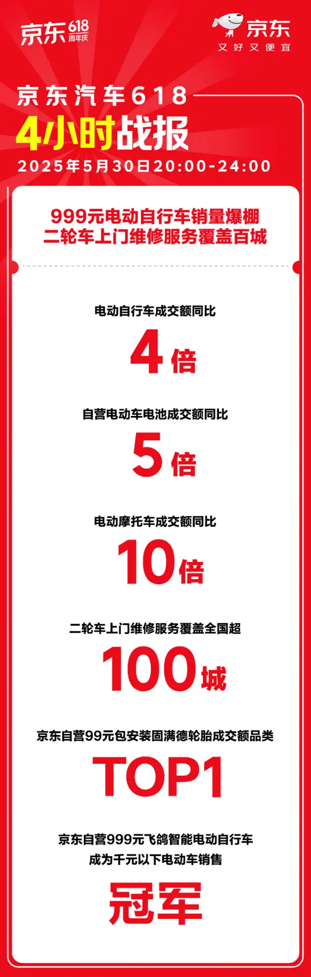 在二轮出行领域,电动自行车成交额同比增4倍,其中京东自营999元飞鸽电动车订单量登顶品类千元以下价格段TOP1,电动摩托车成交额同比飙升10倍。二轮配套及养护服务同步爆发,京东自营99元包安装的固满德轮胎成交额强势斩获品类TOP1,自营电动车电池成交额同比增5倍。同时,京东二轮车上门维修服务已实现全国超100城覆盖,为强劲增长的二轮出行消费保驾护航。