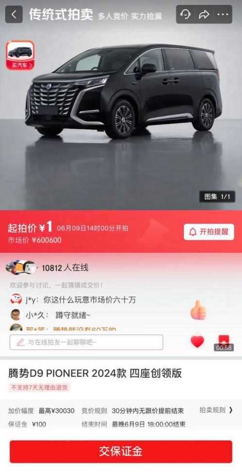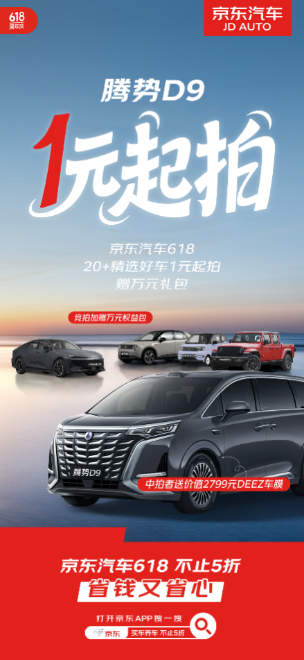 6月9日14点,准时锁定京东汽车腾势D9拍卖专场!1元起拍豪华MPV,享专属改色权益。来京东APP,搜索“买车养车 不止5折”,开启梦想座驾竞拍之旅。