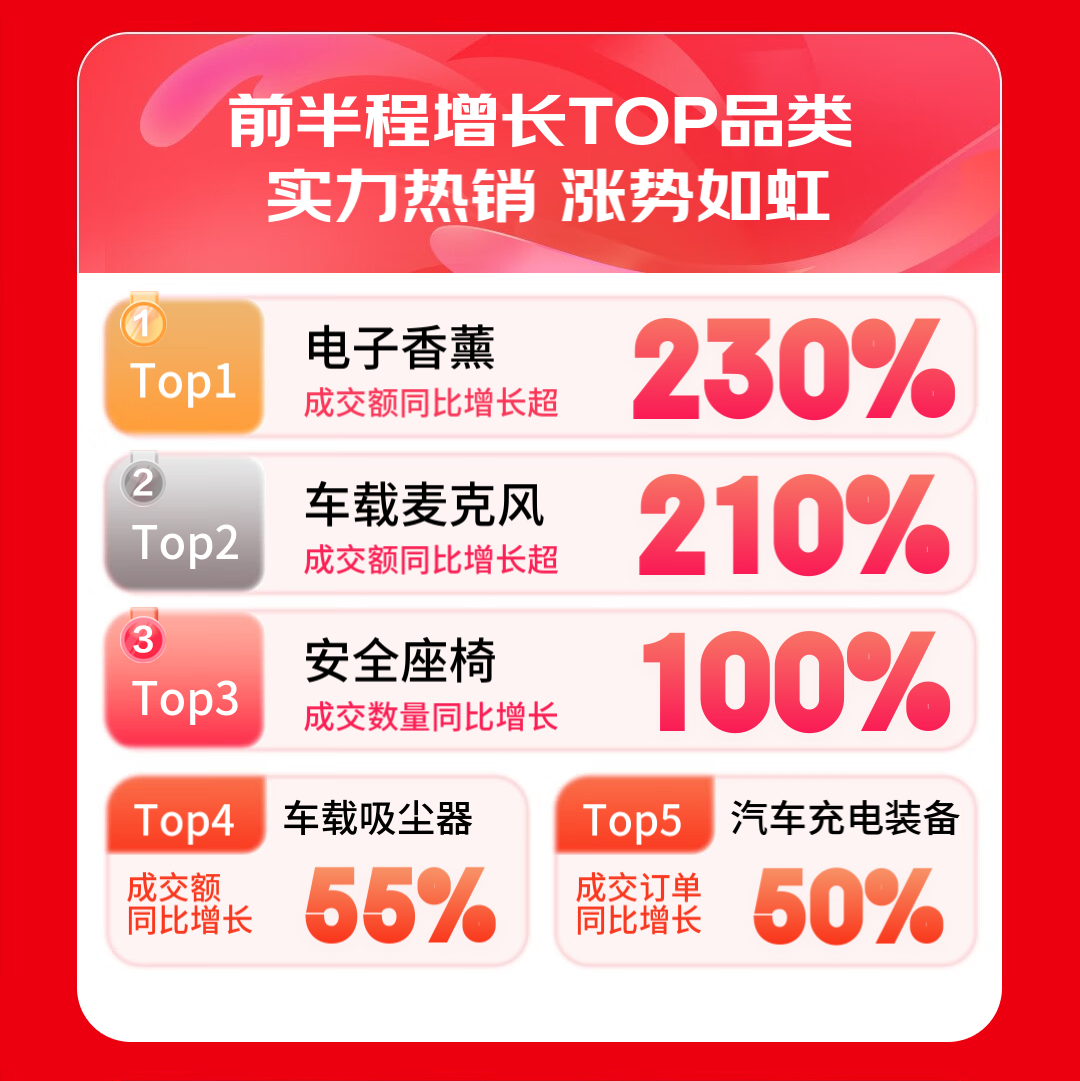 消费者对提升驾乘体验的需求持续高涨。京东汽车618前期,汽车用品细分品类增长数据亮眼,增长最迅猛的TOP5品类分别是电子香薰、车载麦克风、安全座椅、车载吸尘器以及汽车充电装备。其中,车载智能娱乐装备热销,个性化驾乘体验成新潮流,电子香薰成交额同比增长超230%,车载麦克风成交额同比增长超210%。家庭出行安全需求爆发,带动儿童安全座椅销售提升,成交数量同比增长100%。与此同时,车载吸尘器成交额同比增长55%,汽车充电装备成交订单同比增长50%。
