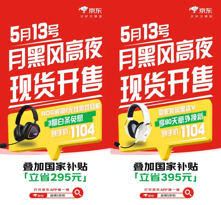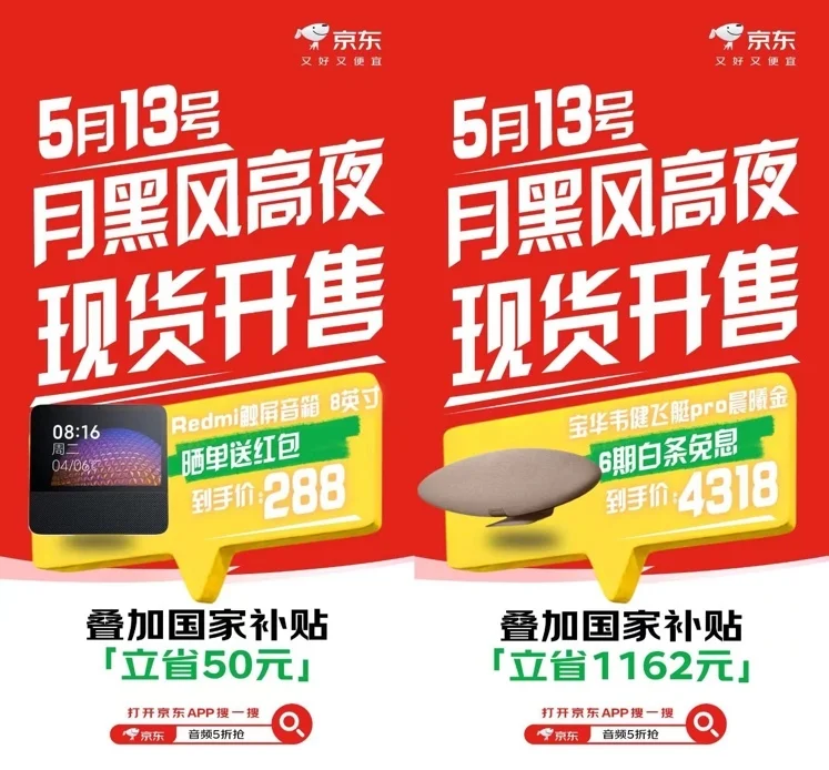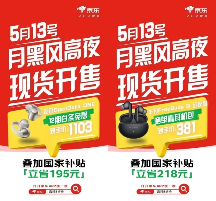 5月13日晚8点,打开京东App搜索“音频5折抢”,无论是宅家享受影音盛宴,还是游戏战场先发制人,锁定耳机音箱现货,享京东直降叠加国家补贴,开启属于你的高品质音质新生活!