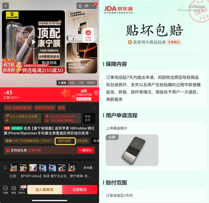 手机、电脑贴膜过程中出现起泡、碎裂、损坏等问题,一直困扰着广大数码产品用户。为此,京东3C数码配件推出“贴坏包赔”服务。消费者购买带有“贴坏包赔”标识的贴膜商品后,若在贴膜过程中出现膜体损坏,或因物流原因导致商品及包装损坏、丢失,可在订单完成后的7天内提交申请,京东将极速响应,提供免费补发或退款服务,让贴膜焕新更轻松。