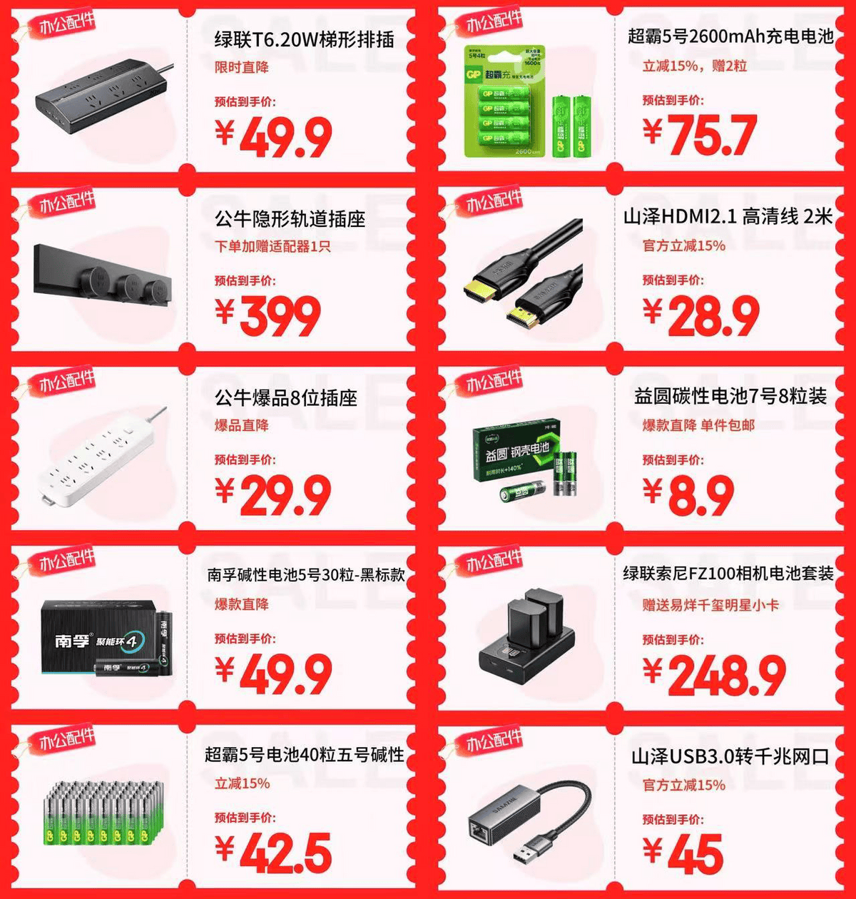 在办公配件中,绿联T6.20W梯形排插限时直降预估到手价49.9元,南孚碱性电池5号30粒-黑标款到手价49.9元,山泽HDMI2.1高清线 2米官方立减15%,28.9元带回家,有需求的朋友们看清单下单,闭眼买也能享受超划算价格。