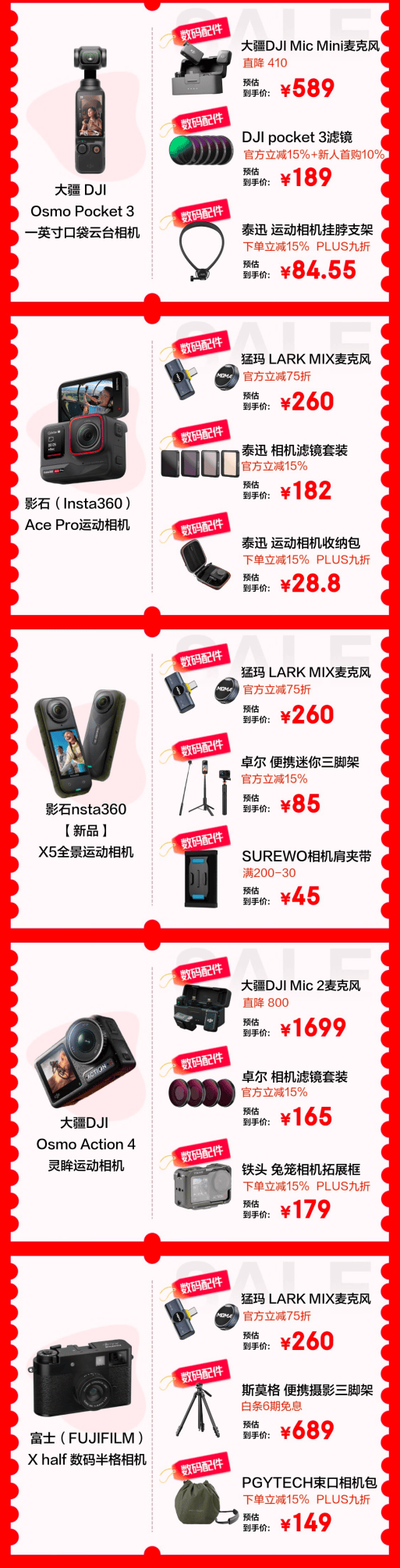 凭借网友分享的系列超出片样张,大疆、富士等相机可谓是实力出圈,带动滤镜、三脚架等配件装备也火了一把。备受用户青睐的大疆pocket 3滤镜官方立减15%+新人首购10%,到手价仅189元;猛犸 LARK MIX麦克风官方立减75折,到手价260元……超多爆品买到就是赚到。