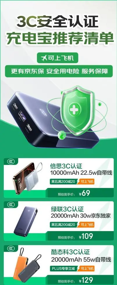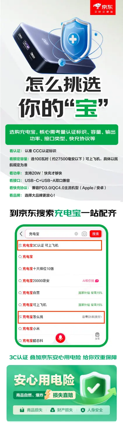 日常旅行、出差时,一款充电快速又安全的充电宝是保持设备在线的重要保障。为助力消费者顺利登机并享受安全便捷的移动充电体验,京东特别推出 “3C 安全认证充电宝” 挑选攻略,并同时提供“安心用电” 服务打造双重保障,凡是购买带服务标识的充电宝,若因质量问题引发安全事故,可通过理赔获赔。目前,还有满200减20、百亿补贴等超值优惠,快打开京东APP搜索“充电宝”,安心选购3C认证的充电宝产品吧!