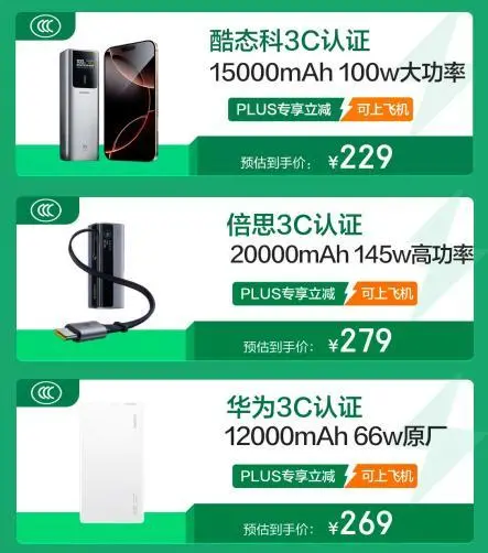 同时,酷态科3C认证15000mAh100w大功率充电宝,配备液晶显示屏,科技感十足,可实时查看剩余电量及充电功率,100W高速快充让设备迅速回血,预估229元就能收入囊中。倍思3C认证20000mAh145w高功率充电宝,带来145W超功率输出,满足高功率设备充电需求,预估279元即可入手。华为3C认证12000mAh 66w超级快充移动电源,支持双击按键进入小电流模式,操作简便,现在下单享受PLUS专享立减,到手预估269元。