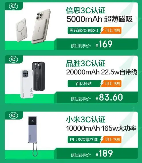 不仅如此,想要入手磁吸充电宝的朋友可关注倍思3C认证5000mAh 超薄磁吸充电宝,即使在跑步、骑车等运动场景时,它也能做到充电时稳固不易脱落,现在下单预估269元就能到手。品胜3C认证20000mAh 22.5w自带线充电宝内置智能充电管理系统,能够自动识别并适配不同设备的充电需求,提供最佳充电方案。小米3C认证10000mAh 165w大功率支持最高165W的双口超快充技术,只需短短十几分钟就能让手机等设备快速回血。