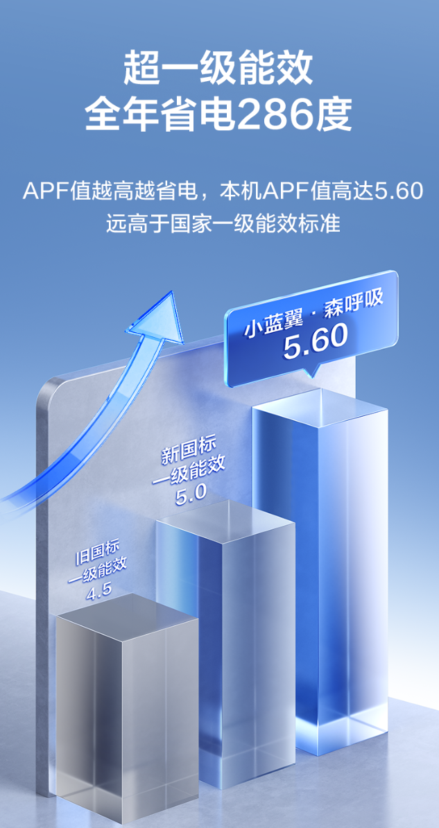 在“双碳”目标背景下,能效是衡量高端家电产品的重要标尺。TCL小蓝翼・森呼吸挂机的AI省电功能展现了卓越的节能表现。其APF值高达5.6,远超国家一级能效标准,意味着在制冷制热过程中拥有极高的能源转换效率,预计全年可省电约286度。