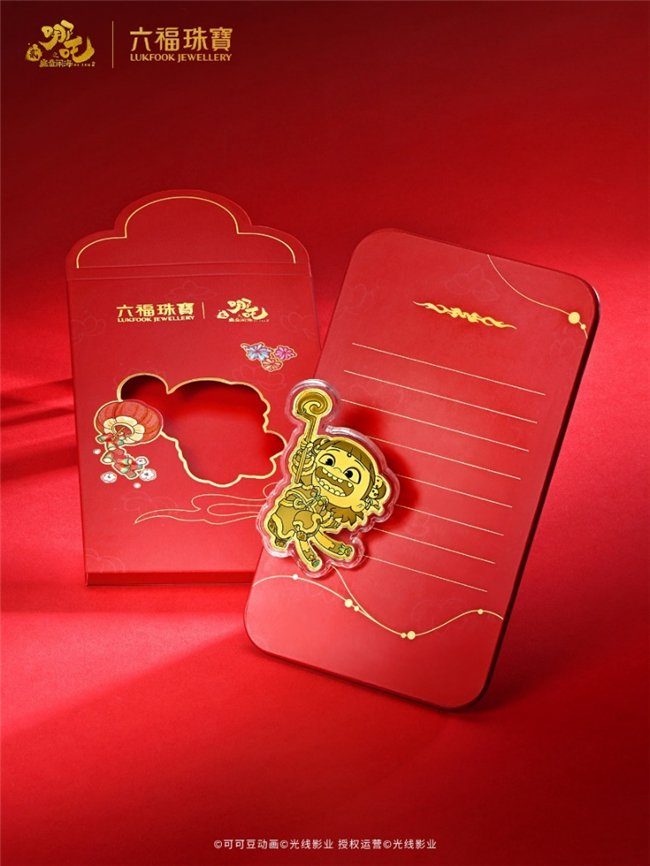 执灯踏福来,好运随身伴。哪吒手执灯笼、欢笑奔跑的鲜活瞬间,步履轻快,灯笼高擎,似在驱散阴霾、照亮前路,尽显少年意气的灵动奔放。将率性洒脱、炽热纯粹的少年英雄,定格于方寸足金之上,匠心雕琢成精致小巧的足金手机贴,以渐变镜面与沙面的分层工艺,搭配微炫彩浮雕的效果,将欢快的动感跃然眼前,丰富的层次让光影熠现活力,绽放璀璨光泽,与“送福上门、好运连连” 的吉祥寓意相映生辉。随赠红包封套的灯笼巧妙连接,以暗纹莲花为底、点缀烟花、鞭炮等喜庆元素,倍添典雅吉祥之感。封套内更附有心意卡,亲手书写的美好祝福,让这枚随身金饰不再是精致的藏品,更是传递情感的温暖载体。