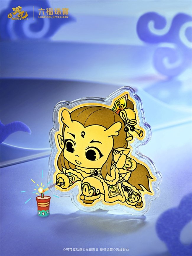 扭转命运,自证乾坤!人人喜爱的哪吒不信天命,以一腔烈焰,执枪破局。设计师以古灵精怪的哪吒形象为灵感设计,灵眸上挑,闪烁凌厉,将倔强的眼神栩栩呈现;红棕基调鎏彩与光砂效果点睛,让哪吒额间的魔丸玄纹更添几分不羁与神秘。此款哪吒大头形象足金串饰可爱萌趣,将勇敢不羁、唯我主宰的坚定勇气萌动彰显;全身款足金串饰身体还可灵活晃动,仿若哪吒踏风而来,让腕间一隅充满鲜活生命力。愿每一个自由勇敢的“小孩”燃热爱成光,步步向前。