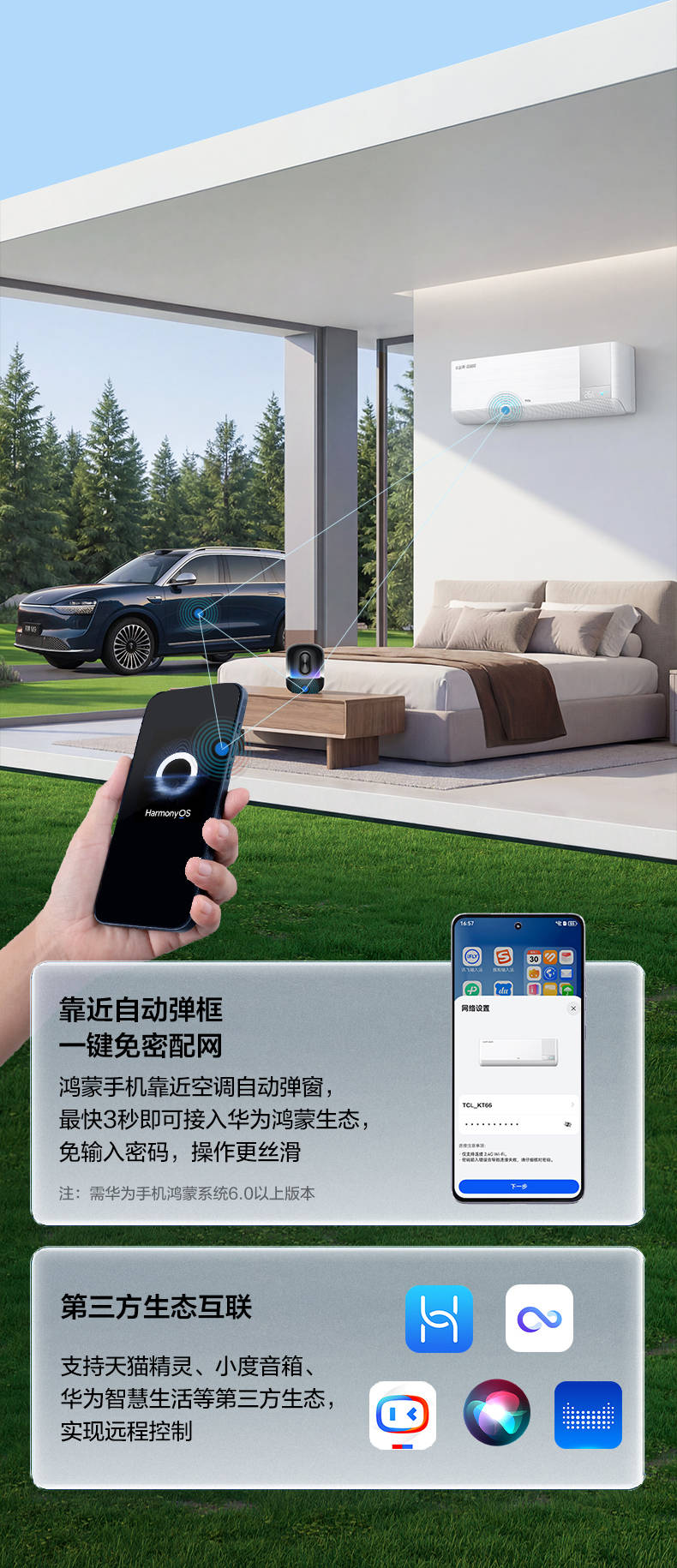 此外,TCL小蓝翼·森林风AI健康新风空调还支持鸿蒙生态系统,内置海思WiFi 6芯片,通过OpenHarmony 5.0兼容性认证,可与鸿蒙生态内的智能家居、智能汽车、智能穿戴设备实现无缝互联互通。用户可仅通过华为小艺语音助手即可实现跨设备控制,构建“人车家”全场景智慧生活体验。