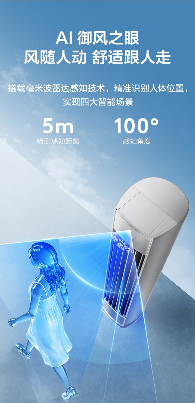 AI御风之眼是核心亮点——通过搭载的毫米波雷达实时感知人体位置与移动轨迹,空调可自动调整风向,确保气流始终跟随用户,即使在大空间内也能实现“风随人动”“人近风柔/人远风强”的精准送风。