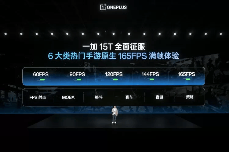 在第五代骁龙 8 至尊版移动平台与独家自研芯片级游戏技术新一代「风驰游戏内核」加持下,一加 15T 成为小屏手机中唯一支持 165 超高帧游戏体验的产品。相比普通 120 帧,165 超高帧每秒可多输出 45 帧画面,显示速度提升 27%,操作响应时间缩短 10ms,操控速度提升 17%,能够助力用户在瞬息万变的对战中更快捕捉敌人信息,获得更大竞技优势。一加 15T 支持《和平精英》、《三角洲行动》等主流 FPS 射击类游戏原生 165 超高帧模式,同时支持MOBA、格斗、赛车、音游、策略共六大类热门手游原生 165 帧超高帧率,引领小屏手机游戏体验进入超高帧时代。
