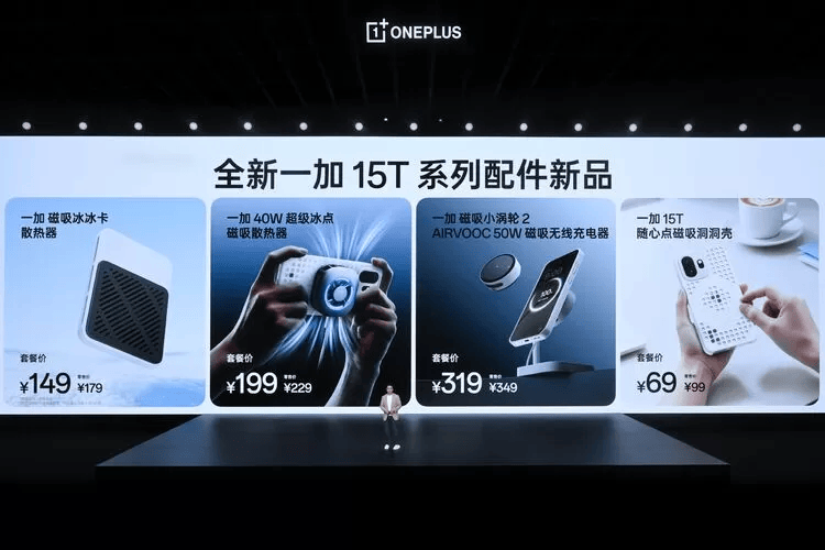 本次发布会上,一加还带来了一系列“又小、又强、又帅、又好玩”的全新专属配件:包括全行业首创的超薄磁吸风冷散热器「一加磁吸冰冰卡」、拥有市面最高 40W 功率的「超级冰点磁吸散热器」、新增桌面支架与多模式调节的「小涡轮 2 代」磁吸无线充,以及质感十足的专属配色「洞洞壳」。以上配件与手机搭配购买,均可享受立减 30 元的套餐专属优惠。