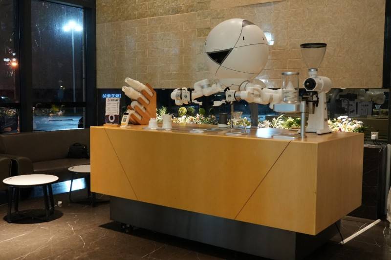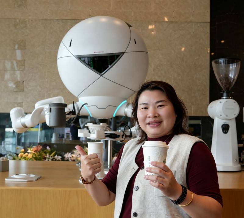 步入娱筷海鲜酒家内的咖啡体验中心,目光即刻被吧台后从容运作的核心主角——“铁蛋”智能机器人所吸引。它打破传统机械臂的刻板印象,以极具设计感的造型与丝滑流畅的运作姿态,重新定义“咖啡大师”的全新形态,将科技美学融入每一个细节。