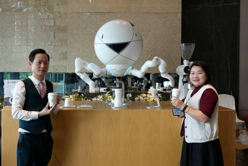 从取豆、精准研磨,到萃取提纯、匠心冲泡,“铁蛋”以毫秒级精度复刻业界高标准“四段式冲泡”工艺,每一个动作都精准把控、行云流水。机械臂的屈伸、旋转与平移,精准而优雅,宛如深耕咖啡艺术数十年的匠人,于方寸吧台间,将科技的精准与手冲的匠心完美融合,每一个瞬间都彰显着未来感与仪式感,成为全场瞩目的焦点。