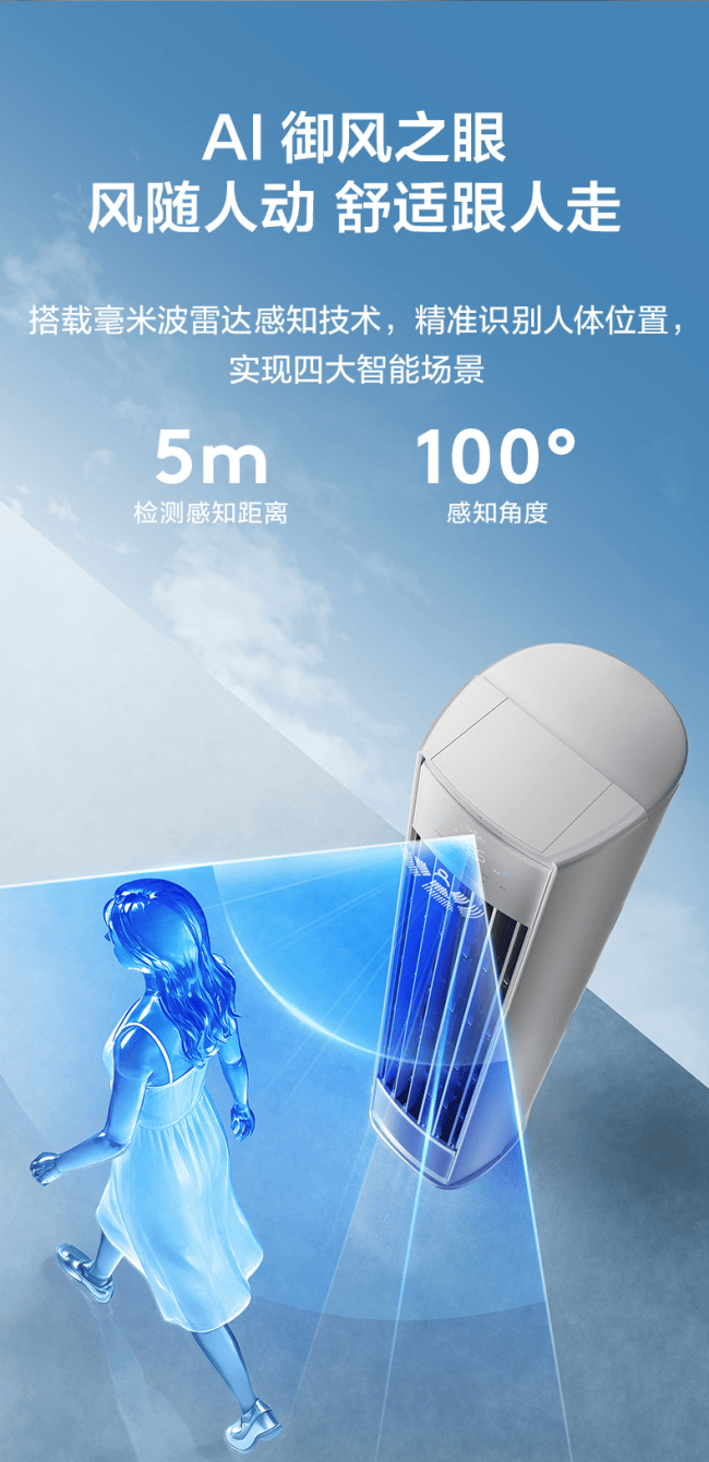 AI御风之眼舒适科技,可以判断及追踪人体位置、数量、轨迹、活动量,活动区域位置,构建个性化送风策略模型,实现风随人动,风避人吹,人近风柔、人远风强,人走节能!这不是简单的调风速,而是空调主动感知家庭成员的需求,让每个人都能找到自己的舒适区。