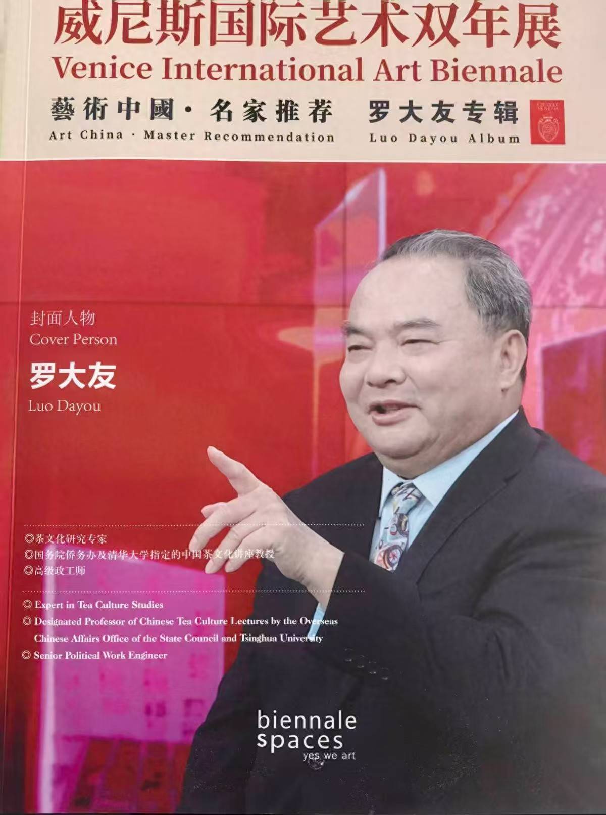 据悉,威尼斯国际艺术双年展创办于1895年,是全球历史最悠久、影响力最深远的当代艺术展之一,被誉为“艺术界的奥林匹克”,是全球文化软实力展示与国际艺术对话的重要平台。此次“艺术中国·名家推荐”系列专辑聚焦中国文化领域的杰出实践者,旨在向世界展现中国文化的多元内涵与时代活力。罗大友的入选,既是对其个人文化贡献的高度认可,更是中国茶文化走向国际艺术舞台的重要突破。专辑中,罗大友以封面人物身份亮相,全面展现其茶文化研究与实践成果,这标志着中国茶文化以其独特的艺术价值和人文内涵,正式进入了全球顶级艺术殿堂的视野。