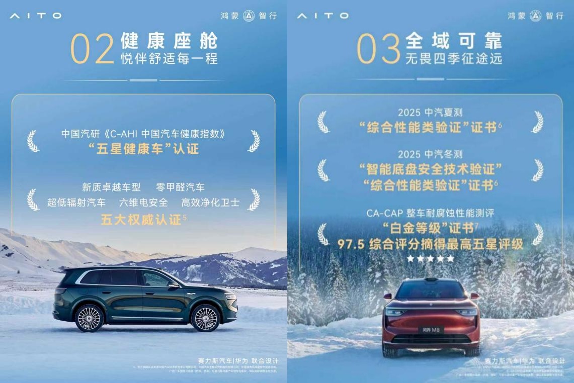 作为一款家庭旗舰,问界M8将智能科技、舒适体验与家庭出行场景深度融合,从座舱体验到动力表现,从智能交互到安全防护,每一处细节都彰显旗舰水准。问界M8对“新豪华”的实践与探索也收获了专业领域的全面认可。上市一年,其已收获C-NCAP(2024版)超五星安全认证、《C-AHI中国汽车健康指数》“五星健康车”认证、CA-CAP整车耐腐蚀性能测评“白金等级”证书、中汽中心“综合性能类验证”“智能底盘安全技术验证”等多项行业权威认证,全方位印证其作为新豪华标杆的行业地位与核心竞争力。