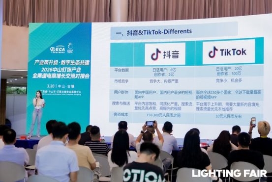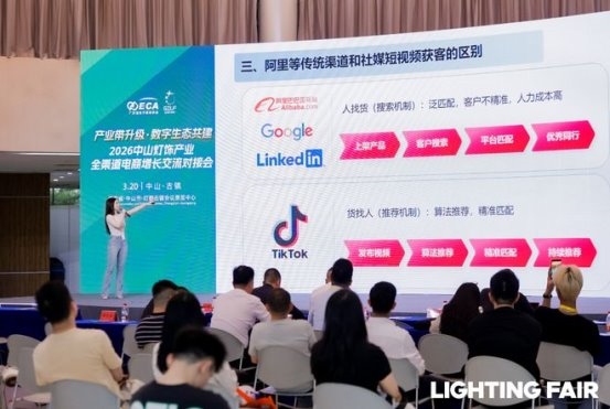 会上,海豚出海创始人芦雨柠指出,TikTok 全球月活超 15 亿,短视频与直播已成为海外家居、灯饰消费的核心决策场景,2026 年平台照明品类 GMV 同比增速超 300%,是灯饰出海的核心增量渠道。她结合灯饰行业特点,详细讲解了如何利用 AI 高效完成多语种素材创作、短视频智能剪辑、本土化文案生成,大幅降低企业内容制作成本与周期;在智能客服环节,通过 AI 多语言实时应答提升海外用户咨询体验,减少沟通壁垒;同时依托大数据与 AI 分析能力,为企业提供精准选品决策参考,适配欧美、东南亚等不同海外市场需求。
