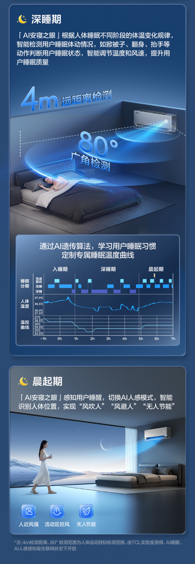 当AI安寝之眼感知用户准备睡觉时,空调会智能开启“AI睡眠”模式,灯光、风感、风速同步调节到最舒服的助眠状态;深睡时,TCL小蓝翼P6 Ultra AI舒适睡眠空调智能调节温度和风速,避免传统空调“后半夜冻醒”的尴尬;晨起后,TCL小蓝翼P6 Ultra AI舒适睡眠空调感知用户睡醒,自动切换AI人感模式,可实现风追人吹、风避人吹、人近风柔、人走节能等细腻体验。更厉害的是,它还能通过AI遗传算法持续学习用户的睡眠习惯,为用户定制专属睡眠温度曲线,让空调越用越懂你的睡眠。