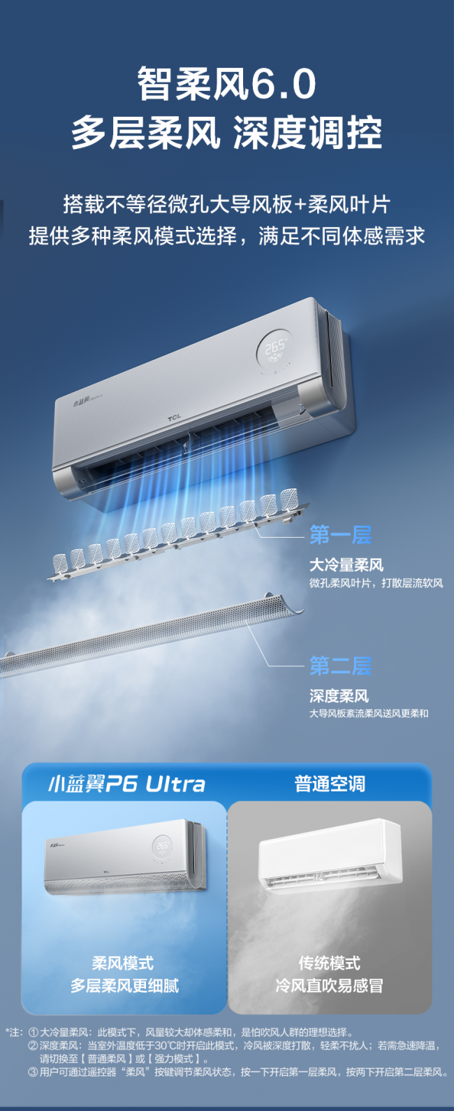 在送风体验上,TCL小蓝翼P6 Ultra AI舒适睡眠空调搭载智柔风6.0技术,搭载不等径微孔大导风板+柔风叶片提供多种柔风模式选择,将传统空调的“硬风”分解为柔和气流,实现立体送风、送风不直吹,有效规避冷风直吹引发的健康问题。