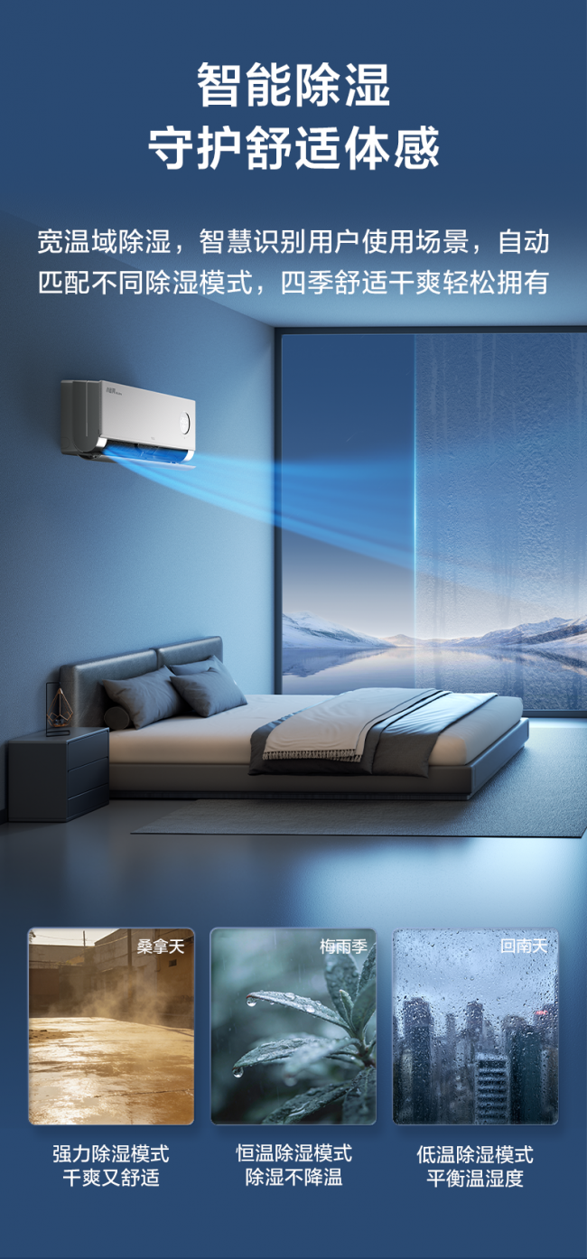 另外,AI恒温除霜技术解决了冬季外机频繁结霜导致的忽冷忽热问题,智能除湿功能可自动识别梅雨季、回南天等场景,实现只除湿不降温,确保卧室四季干爽舒适。