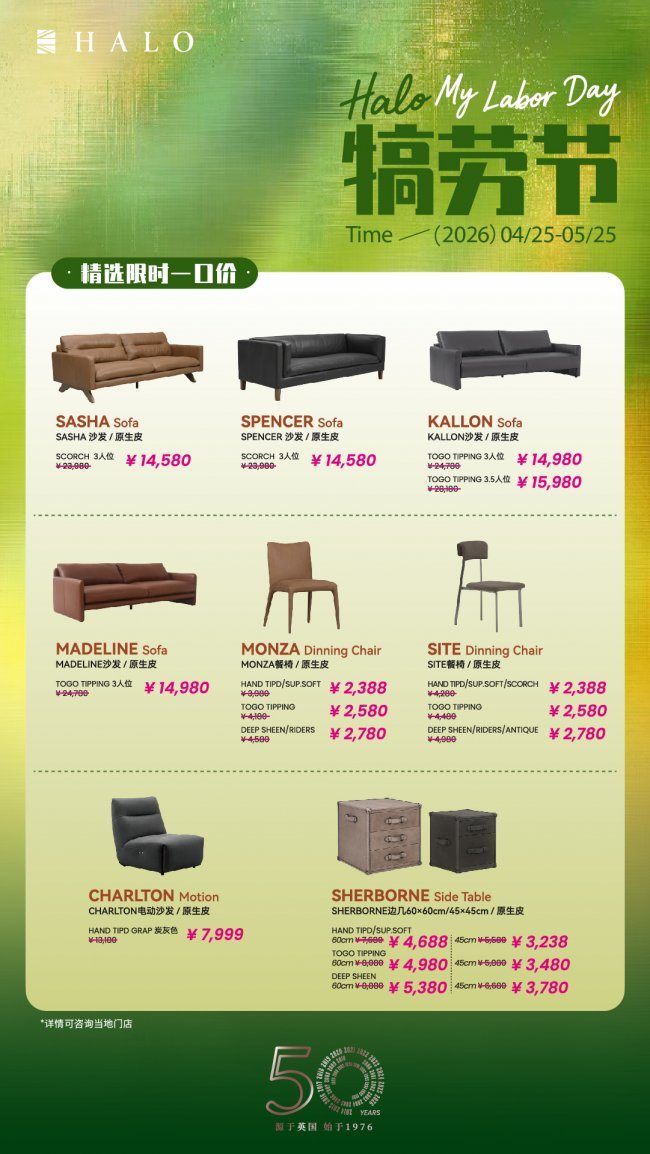 跨越五十载,HALO 光环家居致敬每一位生活家,致敬每一种生活方式,让你真正体验沙发的舒适和手作皮的温润。到店更可收获更多HALO Life会员原生体验互动,这个犒劳节,与其想象,不如亲临。更多活动资讯可关注【HALO光环家居】小红书或全平台搜索【HALO光环家居】,或预约前往线下门店体验,HALO光环家居期待与您相遇!