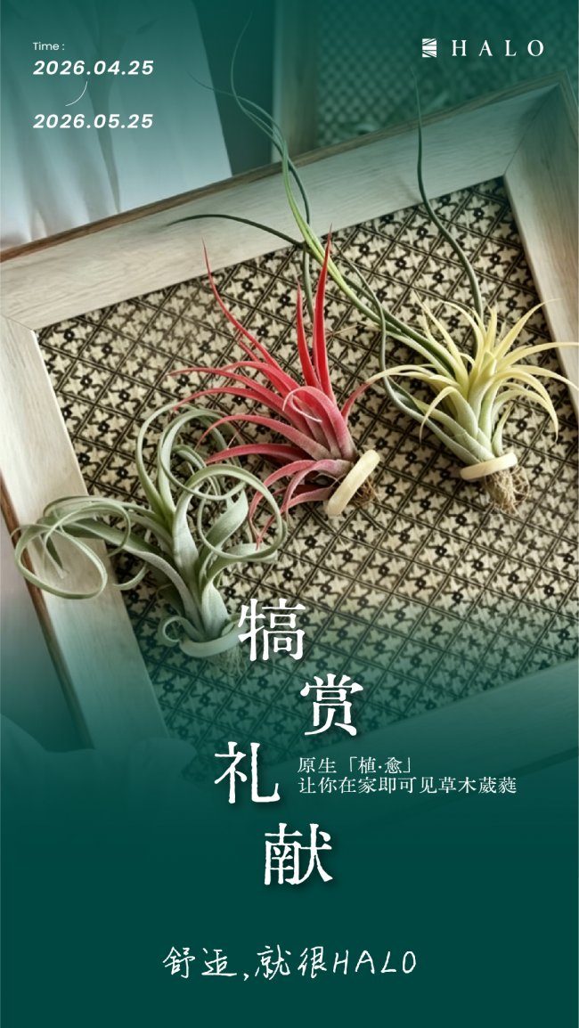 HALO光环家居洞察用户需求,懂生活家们对舒适的执着,犒劳节活动期间诚意礼献原生「植·愈」摆件,用活体植物的天然净化力,为你过滤尘埃,释放鲜氧,让家清新如林。