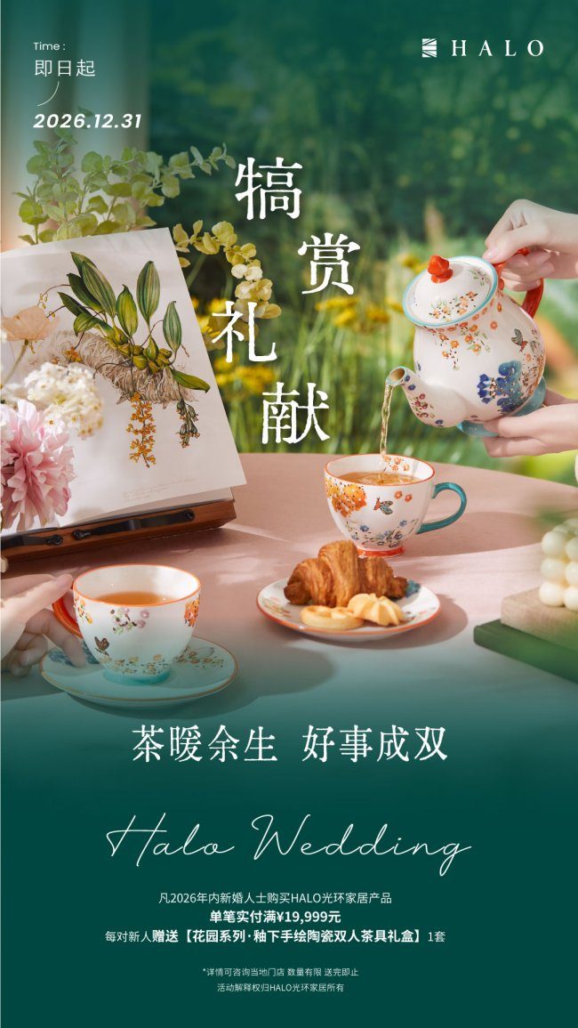 两个人从一间房子开始,慢慢把它过成一个家。沙发记得你们的依偎,餐桌记得你们的笑谈,这个犒劳节,HALO 光环家居为每一对新人备好了一份“双人份的温柔”。即日起至2026年12月31日止,凡2026年内新婚人士购买HALO光环家居产品,单笔实付满¥19,999元每对新人赠送【花园系列·釉下手绘陶瓷双人茶具礼盒】1套。茶暖余生,好事成双,在无数个清晨与深夜,为你们沏出日子的回甘。
