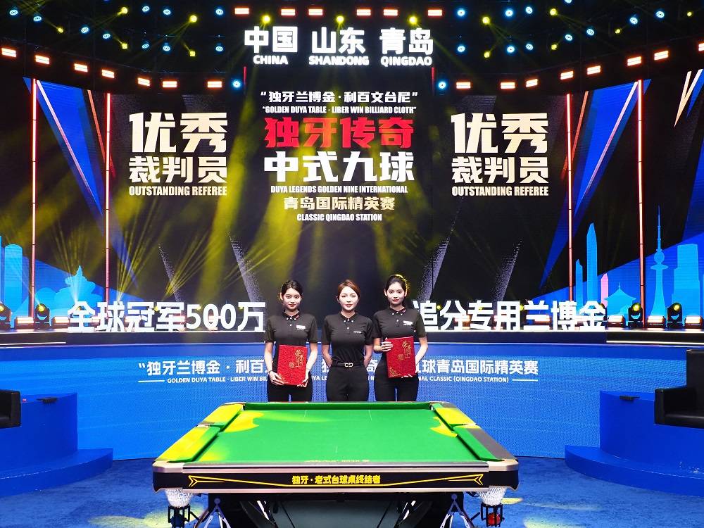 首先颁发的是优秀裁判员奖项。张家炫 黄佳琪两位裁判员以精准、专业的执裁表现,诠释了“公平、公正、公开”的体育精神。独牙传奇中式九球国际巡回赛裁判长王钟瑶女士为两位优秀裁判员颁奖。