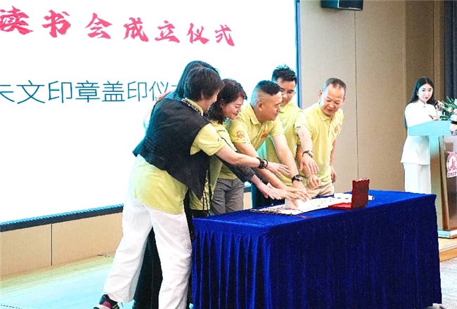 成立仪式庄重而简约。在270°环幕海景的空中图书馆内,一枚朱文印章郑重落下,朱红色的杰中读书会标志在卷轴上清晰呈现——“朱印启航”宣告读书会正式面向社会启幕。随后,联合创始人、主理人获颁证书,全体嘉宾齐声诵读《论语·学而》名篇,以“首读一刻”致敬中华经典。